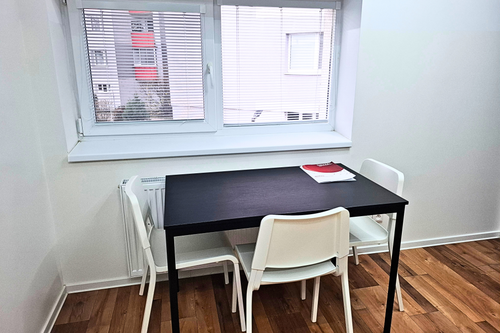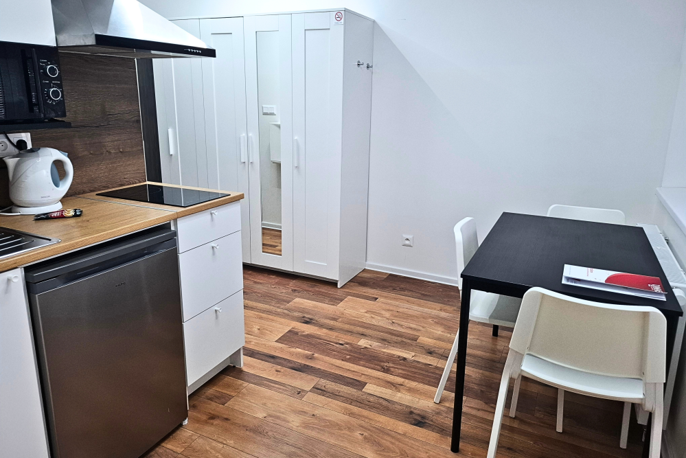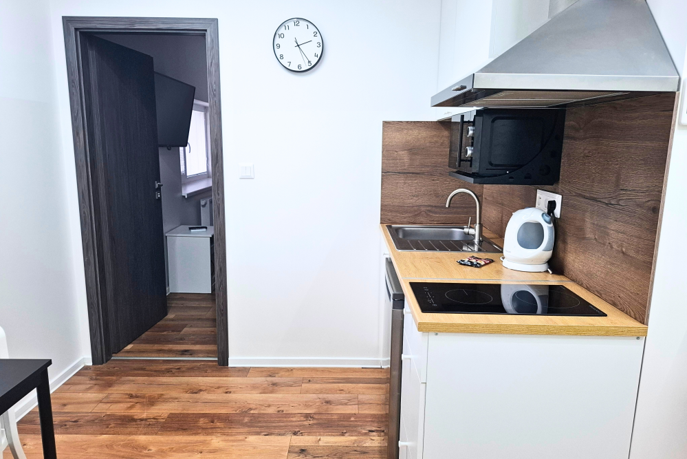 Kuchynka je vybavená základným kuchynským náčiním. Osušky a uteráky sú súčasťou vybavenia. Pri dlhodobom pobyte je v cene ubytovania zahrnuté aj upratovanie 1x týždenne. Práčka a sušička je k dispozícii na prízemí za poplatok 1€.