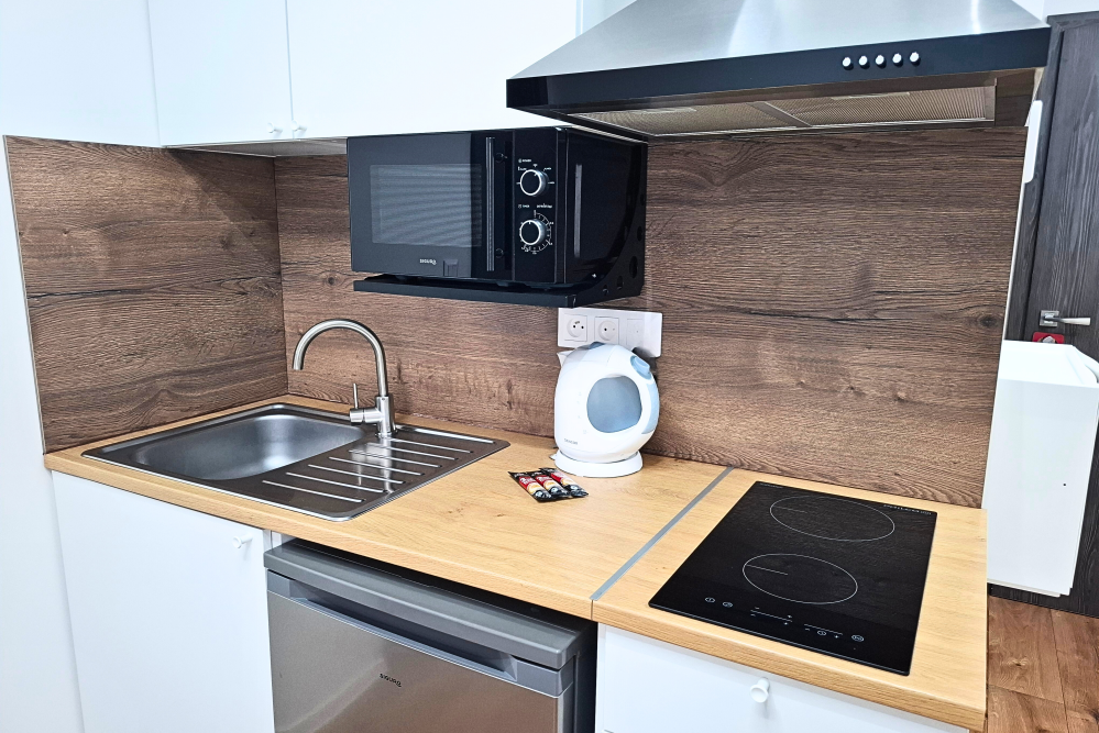 Apartmán má okrem kúpeľne dve miestnosti: kuchynku a spálňu a je vybavený: